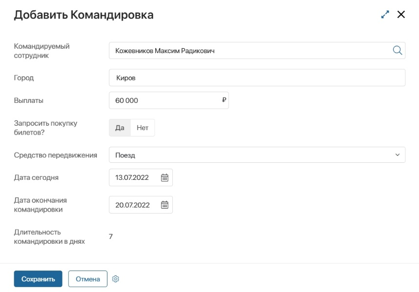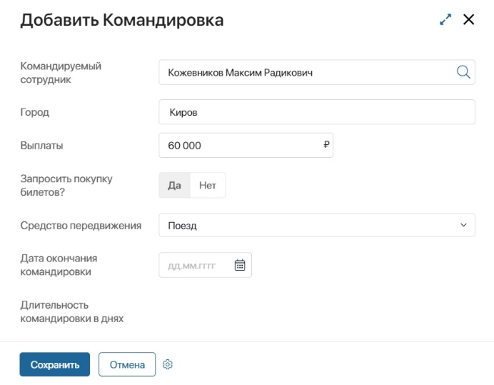 В качестве примера рассмотрим кейс с созданием командировки: с помощью скрипта рассчитаем длительность командировки в днях.