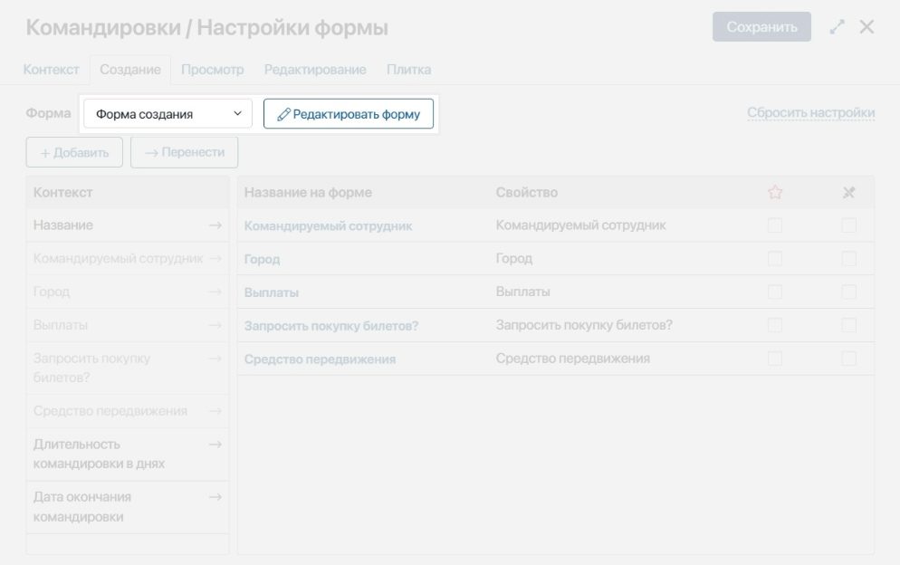 Откроем форму создания в дизайнере интерфейсов и добавим контекстные переменные