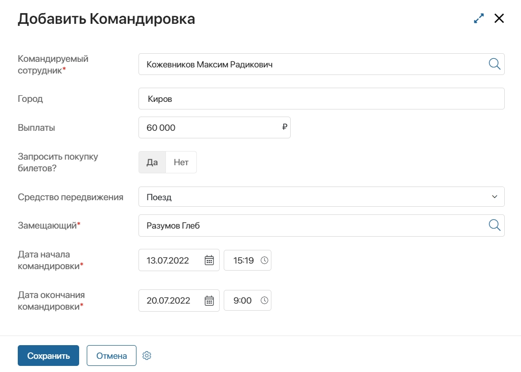 При создании нового замещения необходимо обязательно указать сотрудника, который отправляется в командировку, и сотрудника, который его замещает, а также даты командировки.