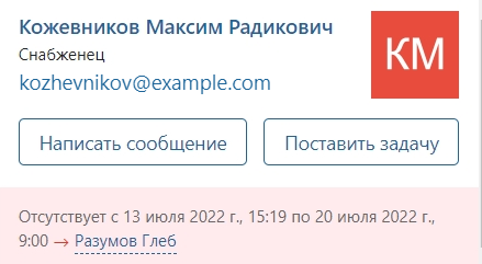 Необходимо, чтобы информация о замещении появилась в системе и была видна другим пользователям, а задачи отсутствующего сотрудника приходили на замещающего.