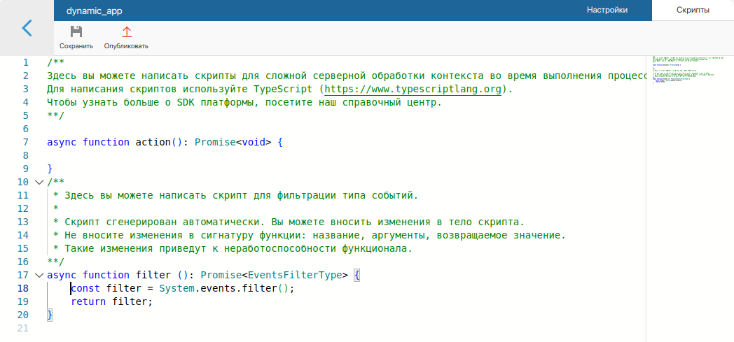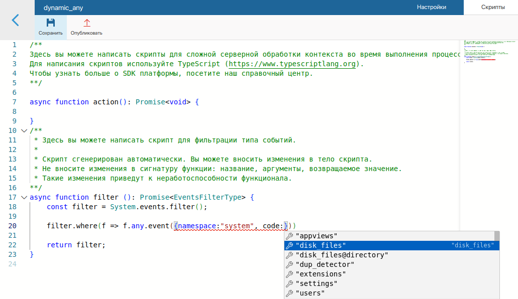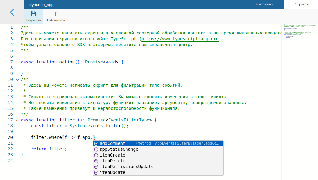 async function filter (): Promise<EventsFilterType> { const filter = System.events.filter(); // Произвольное событие по созданию приложения `invoicesApp` в разделе `ordersNamespace` filter.where(f => f.any.event({namespace:"ordersNamespace", code: "invoicesApp", name:"item_create"})); // Полностью соответствует записи filter.where(f => f.app.itemCreate("ordersNamespace", "invoicesApp")); return filter; }Варианты написания скрипта для динамической фильтрации событий
