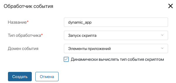 Чтобы настроить динамическую фильтрацию событий по типу, перейдите к созданию обработчика событий, выберите домен и включите опцию Динамически вычислять тип события скриптом. Поле Событие скроется.