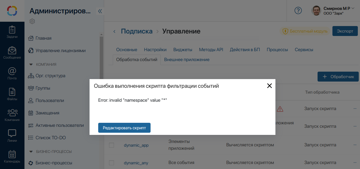 Если при исполнении скрипта фильтрации возникает ошибка, то на вкладке Обработка событий напротив обработчика отобразится значок ошибки.
