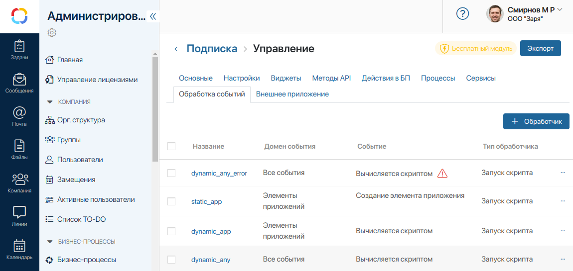 Вы увидите название обработчика и указанный домен события. Изменение домена после создания обработчика недоступно.