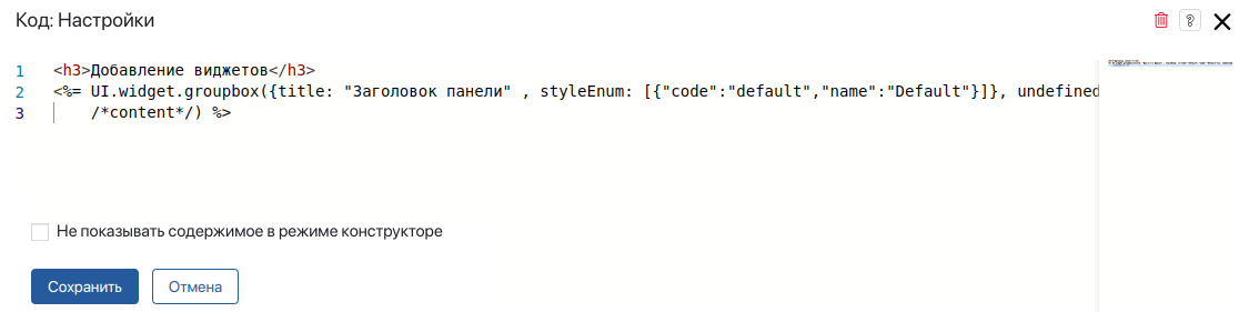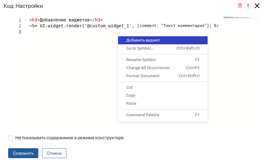 custom_widget_1, который содержит в себе информационный блок и вывод строки из контекста виджета с кодомcomment(Комментарий). Так как в виджете есть свойство контекста, ему можно передать необходимое значение. Для добавления этого виджета через виджет Код напишем следующий скрипт:<%= UI.widget.render('@custom_widget_1', {comment: "Текст комментария"}) %>Помимо написания кода добавления виджета вручную, можно вставить его через контекстное меню. Для этого необходимо нажать правой клавишей мыши на поле в настройках виджета Код и выбрать пункт Добавить виджет.