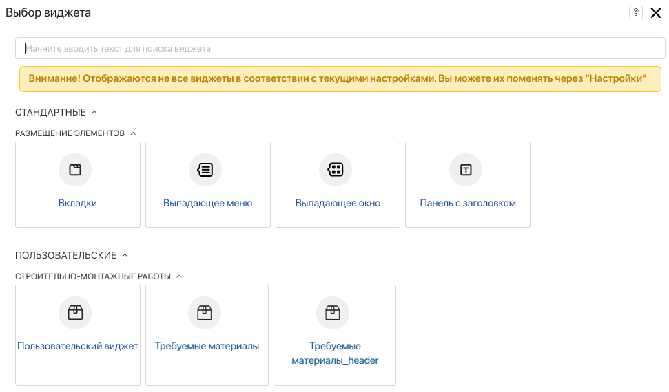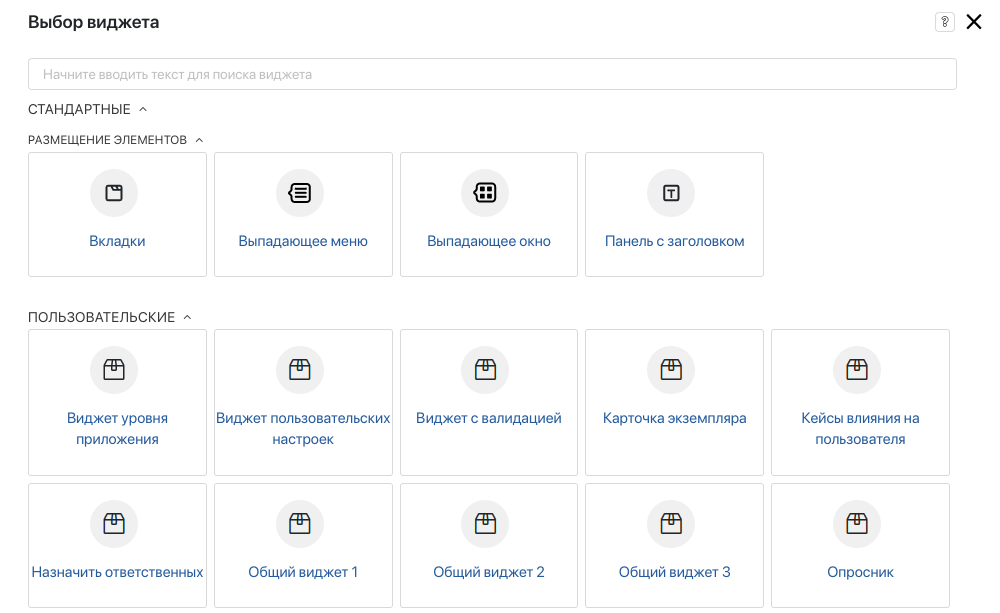 Откроется диалоговое окно добавления виджета. Таким образом можно вставить стандартные виджеты, доступные в скриптах, и пользовательские виджеты, список которых зависит от области видимости. По умолчанию доступны только виджеты того же уровня, что и редактируемый виджет, и виджеты более низких уровней. Например, если мы редактируем виджет уровня раздела, то в нем доступны виджеты этого же раздела, а также виджеты приложений этого раздела.