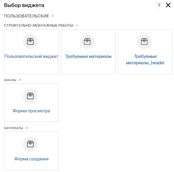 После выбора виджета из списка открывается модальное окно с его настройками: