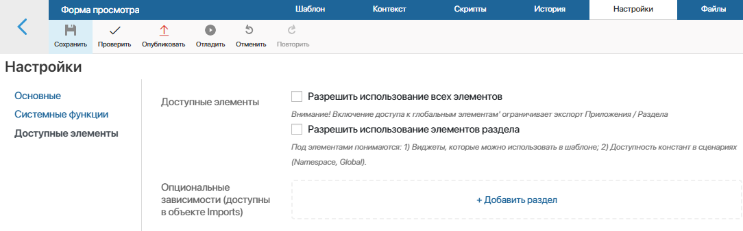 Если в дизайнере открыта форма приложения, то в разделе Доступные элементы будет доступна еще одна настройка — Разрешить использование элементов раздела. Она также расширяет список доступных виджетов, но в пределах данного раздела.