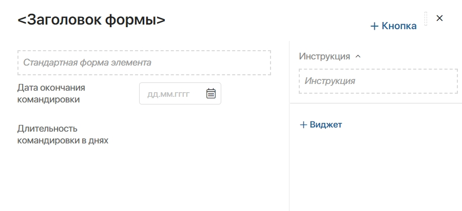 Откроем форму создания в дизайнере интерфейсов и добавим контекстные переменные Дата окончания командировки и Длительность командировки в днях на форму.