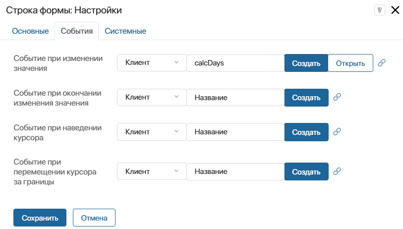 Переходим в настройки поля Планируемое время отгрузки и создаём скрипт на изменение значения на вкладке Событие.