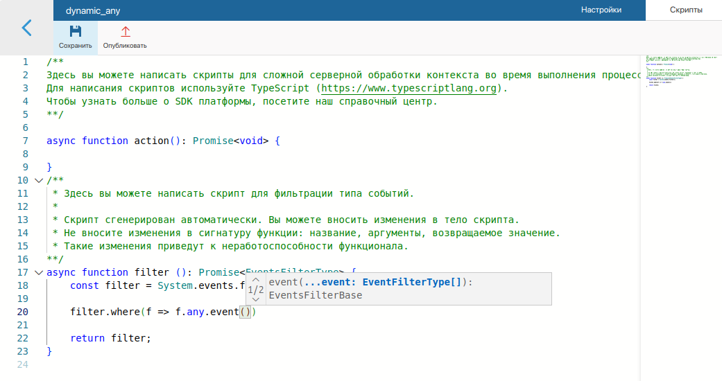 async function filter (): Promise<EventsFilterType> { const filter = System.events.filter(); // Произвольное событие по созданию приложения `invoicesApp` в разделе `ordersNamespace` filter.where(f => f.any.event({namespace:"ordersNamespace", code: "invoicesApp", name:"item_create"})); // Полностью соответствует записи filter.where(f => f.app.itemCreate("ordersNamespace", "invoicesApp")); return filter; }Варианты написания скрипта для динамической фильтрации событий
