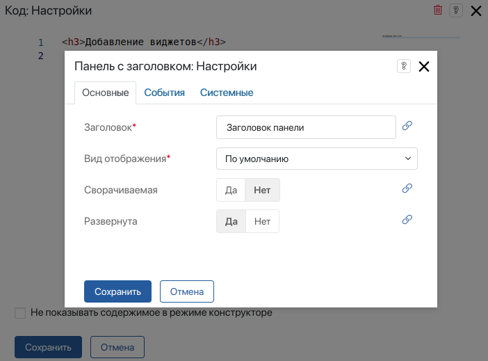 После сохранения код для добавления виджета с указанными настройками вставляется в виджет Код.